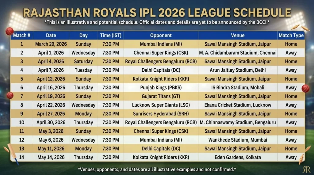 Full Rajasthan Royals IPL 2026 League Schedule (14 Matches)